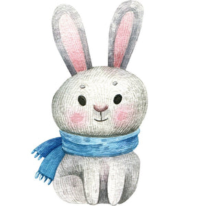The Watercolor Bunny Blue Scarf Fabric Panel is a part of the Watercolor Christmas Stories Fabric Collection printed by Sew Creative Fabrics. This panel is digitally printed on 100% cotton. The fabric panel is available in 6 different sizes: