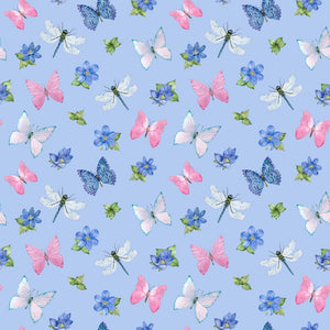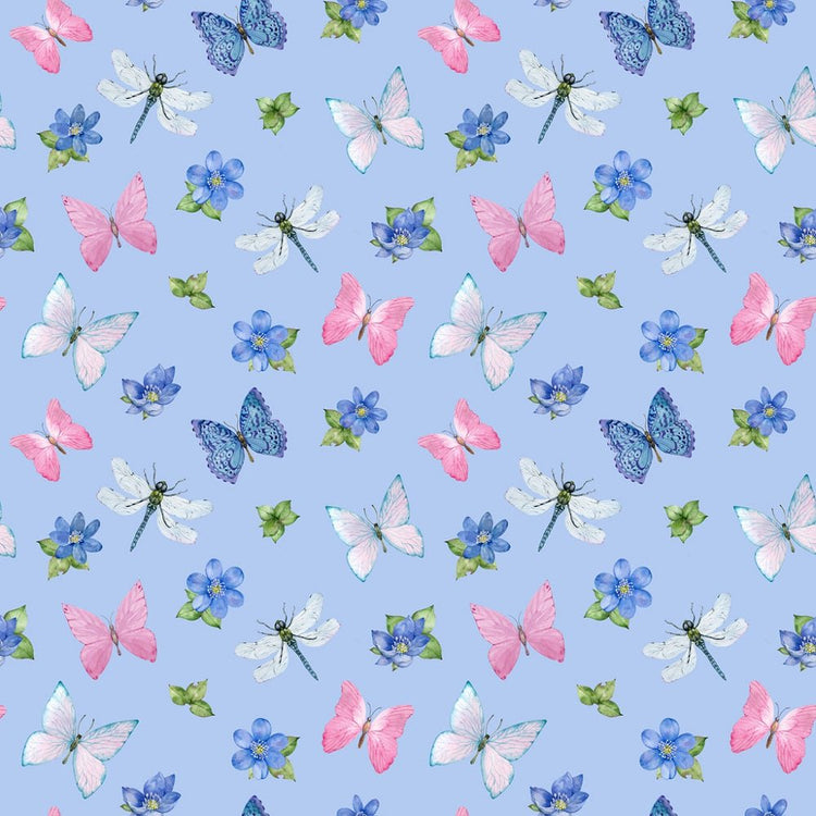 The Blue Watercolor Butterflies, Dragonflies, & Flowers Fabric is printed by Sew Creative Fabrics. Digitally Printed on 100% cotton.