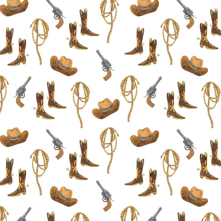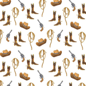 The White Watercolor Cowboy Accessories Fabric is part of the Western Fabric Collection printed by Sewing Parts Online. Digitally Printed on 100% cotton.