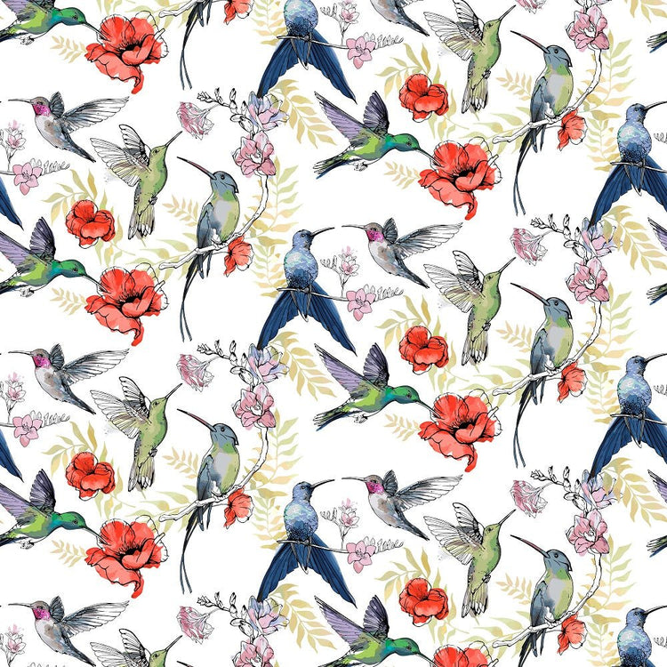 The Watercolor Flowers and Hummingbirds Fabric is part of the Floral Fabric Collection printed by Sew Creative Fabrics. Digitally Printed on 100% cotton.