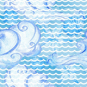 The Watercolor Large Nautical Elements on Waves Fabric is a part of the Hand Painted Nautical Fabric Collection printed by Sew Creative Fabrics. Digitally Printed on 100% cotton.