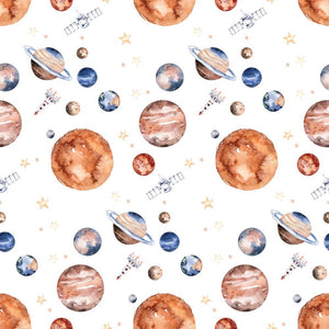 The White Watercolor Planets of the Universe Fabric is part of the Outer Space Fabric Collection printed by Sew Creative Fabrics. Digitally Printed on 100% cotton.