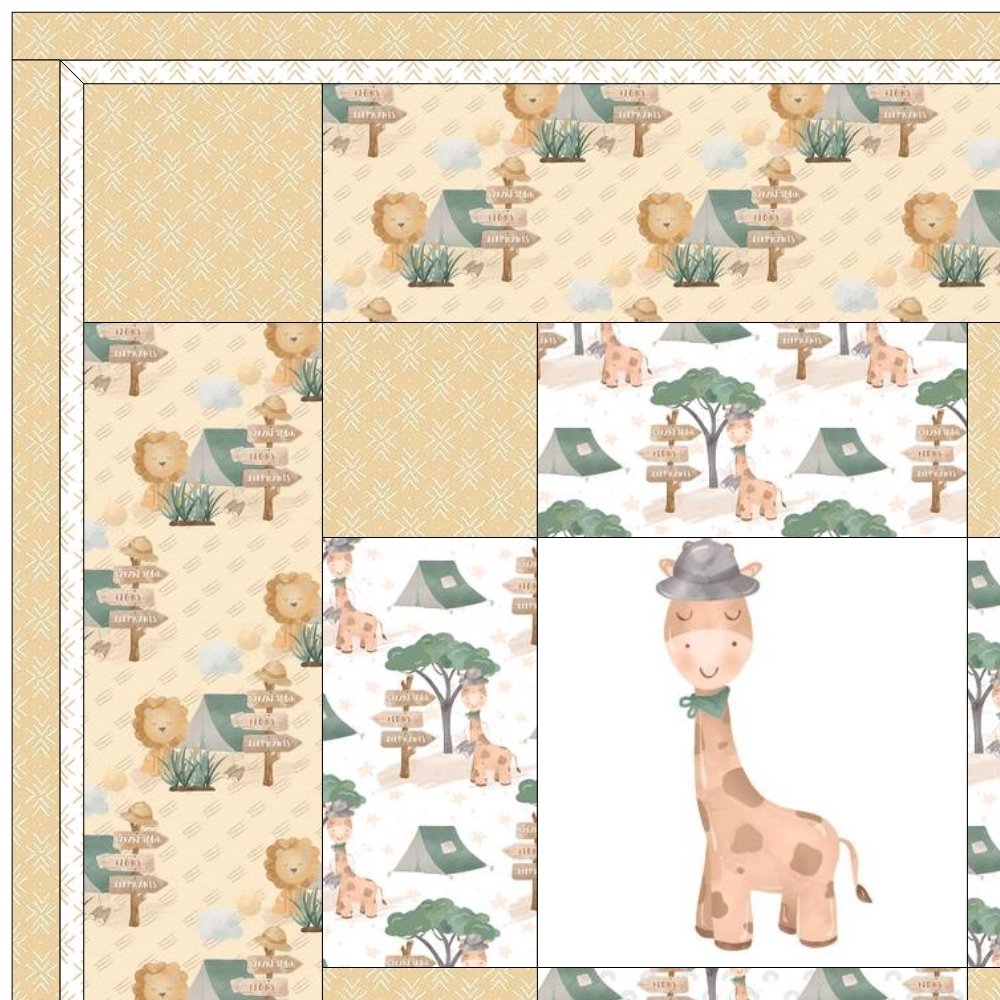 The Watercolor Safari Adventure includes everything you need to make the quilt - the instructions, 20 panels, and a total of 8 yards of fabric for sashing, flange binding, and backing. The quilt kit consists of 20 Uneven Nine Patch quilt blocks. The blocks are set in a grid pattern with centers consisting of 4 1/2" panels from the Watercolor Safari Adventure Collection. They are surrounded by sashing and cornerstones and finished with a flange binding. Batting is sold separately. The finished size of this quilt is 50" x 61 1/2".