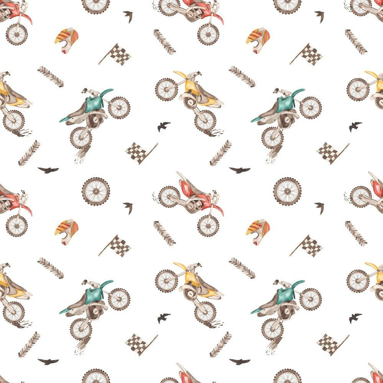 The Watercolor Scattered Dirt Bikes Fabric is part of the Watercolor Dirt Bikes Fabric Collection printed by Sew Creative Fabrics. Digitally Printed on 100% cotton.