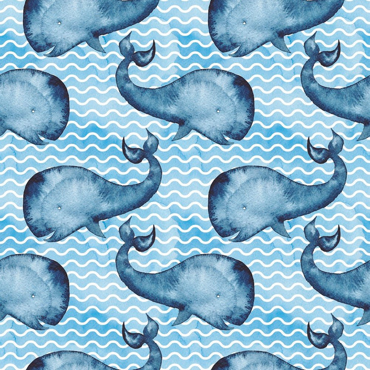 The Watercolor Whales on Waves Fabric is a part of the Hand Painted Nautical Fabric Collection printed by Sew Creative Fabrics. Digitally Printed on 100% cotton.