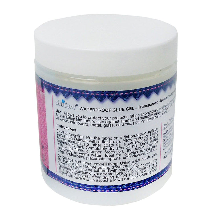 Similar to mod podge, OdiCoat Waterproof Fabric Gel Coating creates a film that insulates and protects your project against both stains and humidity. Use Waterproof Fabric Glue Gel on wood, cardboard, metal, glass, fabric, and much more. OdiCoat Gel Coating will give your fabric an oilcloth-like finish that makes it water resistant. Add it to table runners, umbrellas, hats, aprons, purses, and tote bags. The coating also adds an anti-UV and anti-stain protection to most fabrics. This 8.68oz container includes instructions for waterproofing, embellishing, and creating collages. OdiCoat Waterproof Gel Coating, from Odif, does not contain any acids, solvents, or odors.