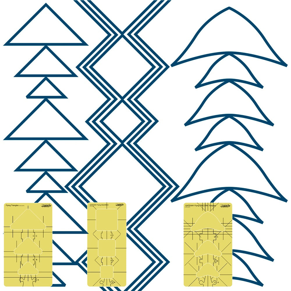 Never run out of designs to quilt with Westalee's London Collection Sampler Set. This three-piece set includes a Flying Triangle Gateway Template, Flying Tricorn Gateway Template, and a Flying Square Gateway Template. Each ruler has three finished sizes (1", 1-1/2", and 2") and includes a center for echoing. The London Collection Sampler Set requires a 1/2" ruler foot (not included). Please note that these acrylic templates are specific to the type of shank your machine uses: low shank, high shank, or longarm. Don't hesitate to get in touch with us at (888) 824-1192 if you have any questions or concerns, or check out this handy Ruler Foot & Template Size Guide here.