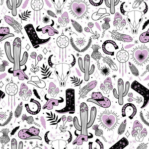 The Purple Western Cowgirl Icons Fabric is part of the Western Fabric Collection printed by Sew Creative Fabrics. Digitally Printed on 100% cotton.