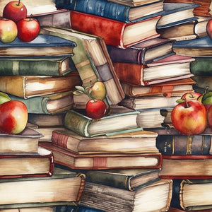Whimsical Stacked Books & Apples Fabric