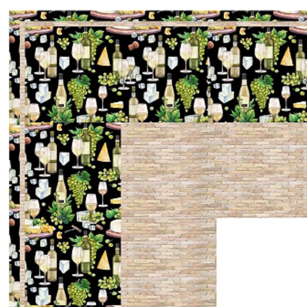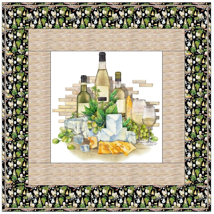 The White Wine Party Wall Hanging includes everything that you need to make the quilt - the instructions and a total of 3 1/2 yards of fabric and a 23" panel. It has two borders and is finished with a flange binding. Batting is sold separately. The finished size of this quilt is 42" x 42".