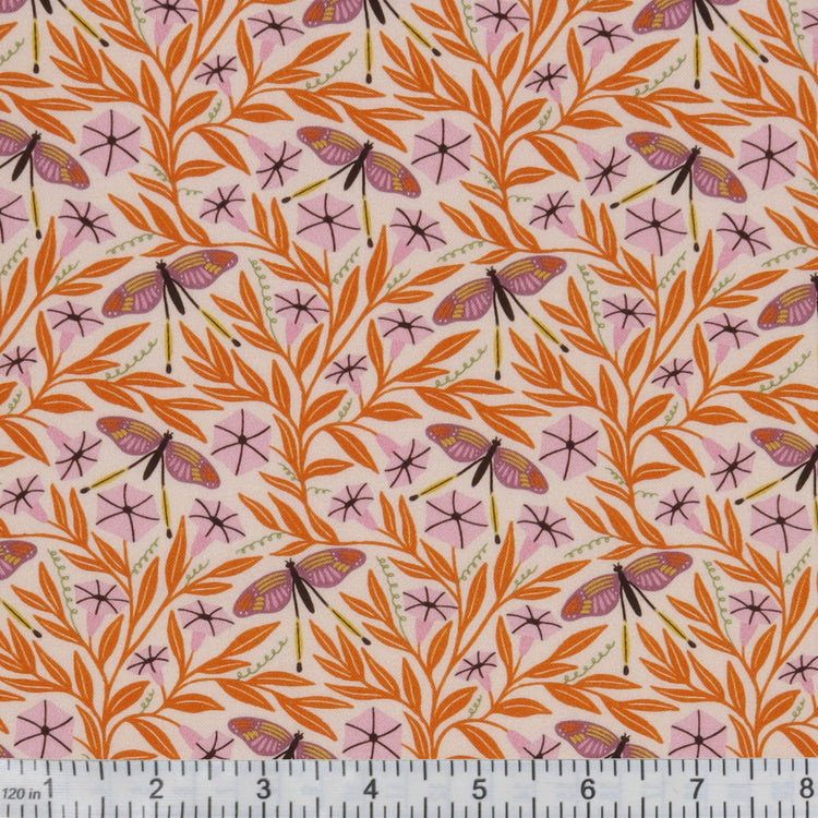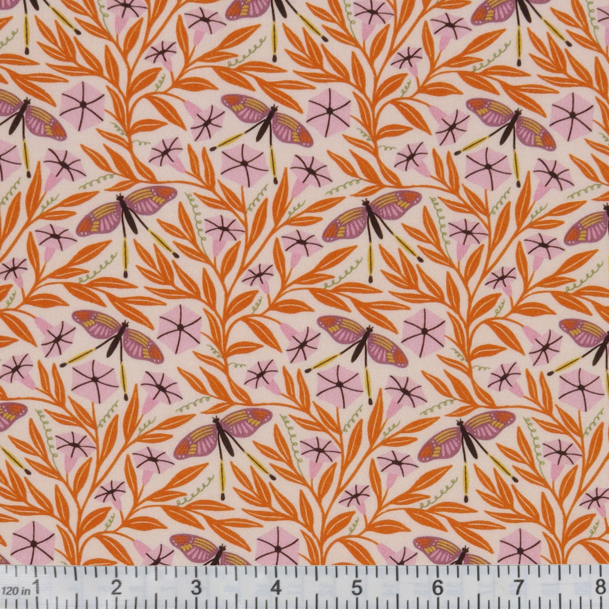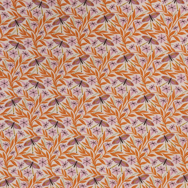 This fabric features a lively, whimsical design with a nature-inspired theme. The pattern includes vibrant dragonflies with intricate wing details in purple, orange, and yellow shades, gracefully flying among a backdrop of leaves and flowers. The leaves are depicted in a bright orange, with a flowing, organic shape that adds movement and energy to the design. Interspersed among the leaves are delicate, geometric flowers in soft pink and purple hues, providing a playful contrast. The background is a light, creamy beige, highlighting the vivid colors of the dragonflies, leaves, and flowers. The overall design is dynamic and enchanting, making this fabric an excellent choice for projects that bring a touch of nature and a burst of color to any space, such as home decor, fashion accessories, or children's apparel.