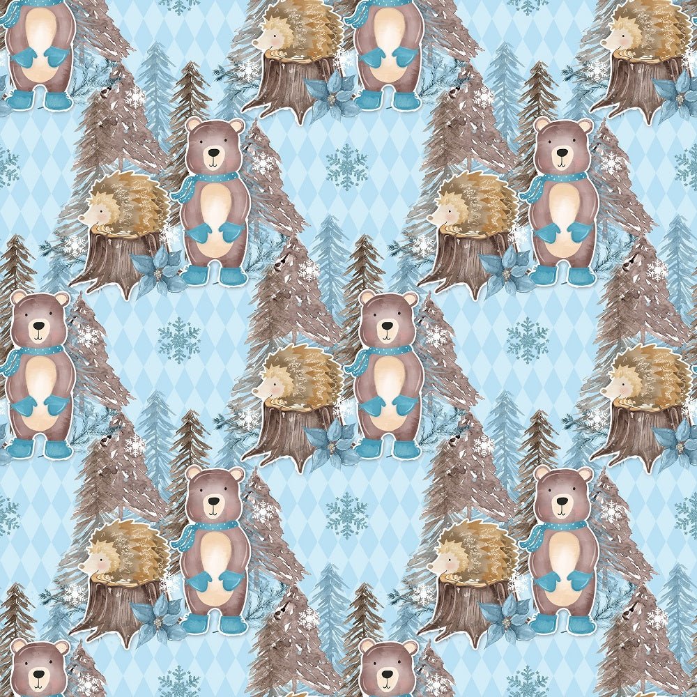Winter Animals Scene on Checkered Fabric - Blue