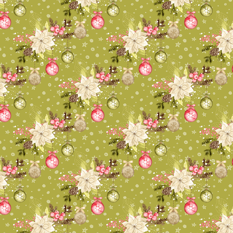 Winter Poinsettias & Ornaments Fabric - Green Details