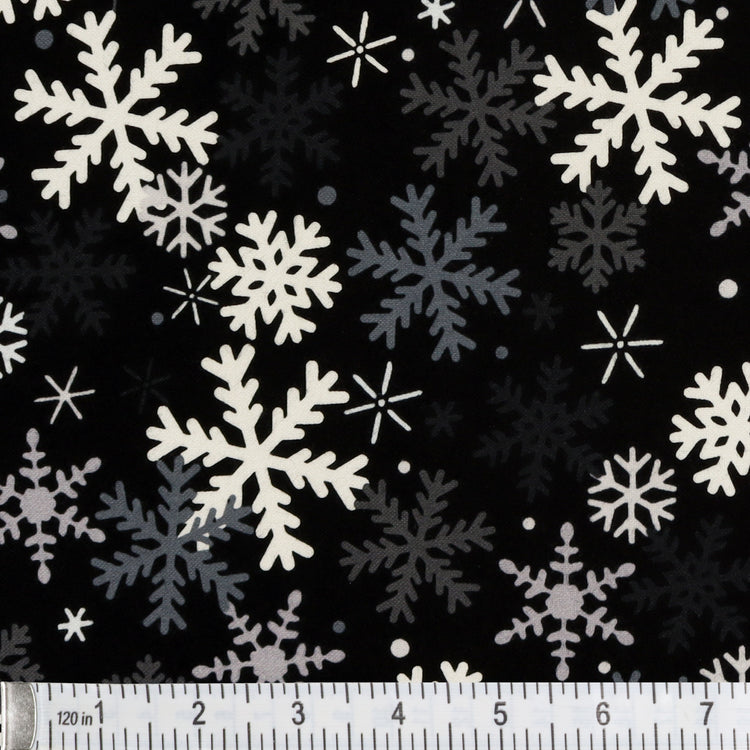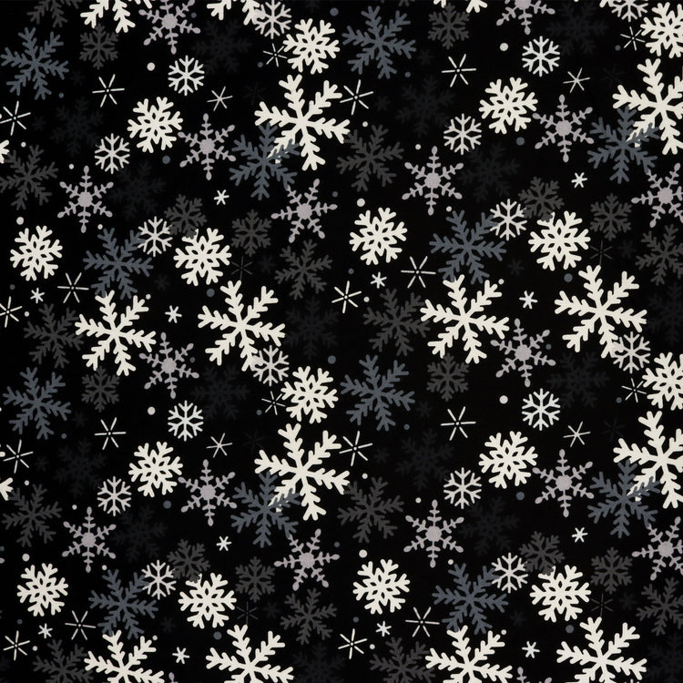 Bold and sophisticated, Winter Snowflakes in Black delivers a striking take on a seasonal classic. Soft white and silver-gray snowflakes scatter across a jet-black backdrop, creating a high-contrast, elegant design that’s perfect for modern holiday makes. Ideal for quilt backings, festive throw pillows, or striking tree skirts, this pattern brings a sense of wintry night skies and snow-covered elegance to your sewing room. Let it be your go-to for projects that need a touch of frosted drama.