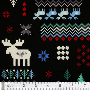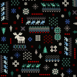 Add bold contrast and festive flair to your winter projects with Winter Wonders Knit in Black. This eye-catching design channels the nostalgic look of knitted holiday sweaters, with pixelated reindeer, snowflakes, trees, birds, and hearts arranged in a charming patchwork layout. The vivid red, green, icy blue, and white motifs pop dramatically against a deep black backdrop, giving this fabric a cozy-meets-modern feel. Ideal for quilts, stockings, and other handmade winter creations, this fabric brings warmth and whimsy in every stitch.
