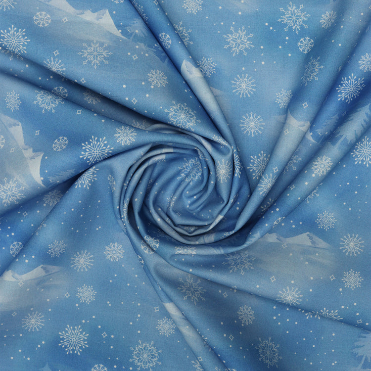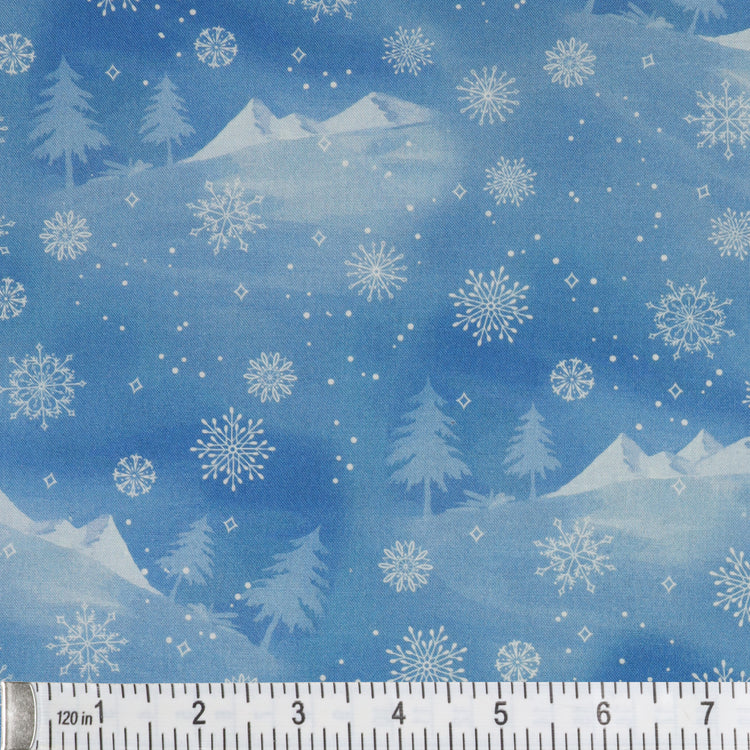 Bring the crisp, invigorating feel of alpine air to your next sewing project with Mountain View Medium Blue. This rich blue print features the same elegant landscape of scattered snowflakes, peaceful pines, and distant mountains, but with a deeper hue that adds dramatic contrast and visual depth. Perfect for borders, backgrounds, or standout quilt blocks, this fabric brings dimension and wintry magic to your creations. Pair it with lighter coordinates for striking results or use it solo for a bold yet tranquil winter look.