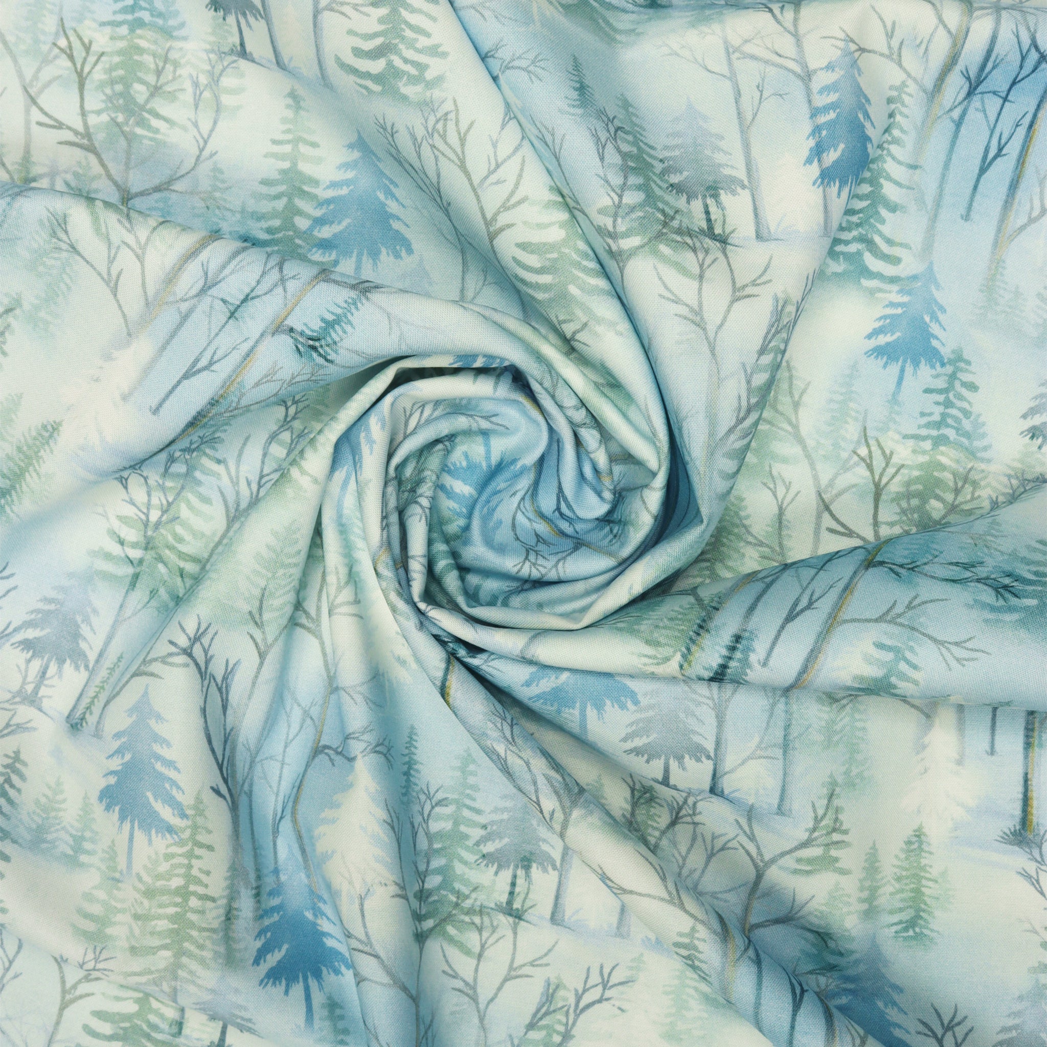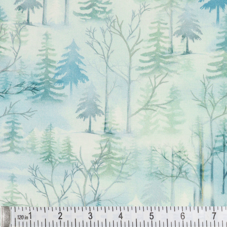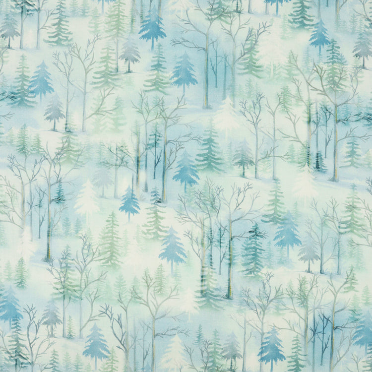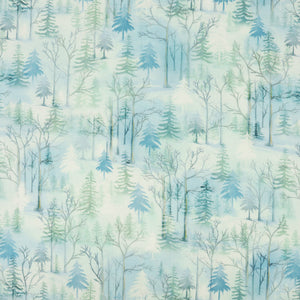 Create a calm and wintry backdrop with the Pine Woodland Light Blue fabric. This softly painted design features layers of evergreens and bare-branched trees in delicate shades of blue, green, and white, evoking the peaceful stillness of a snow-covered forest. The watercolor effect gives the scene a dreamy, ethereal quality, perfect for blending into quilts, borders, or nature-inspired projects. Use it as a subtle scenic print on its own or as a beautiful coordinate for woodland and winter-themed sewing.