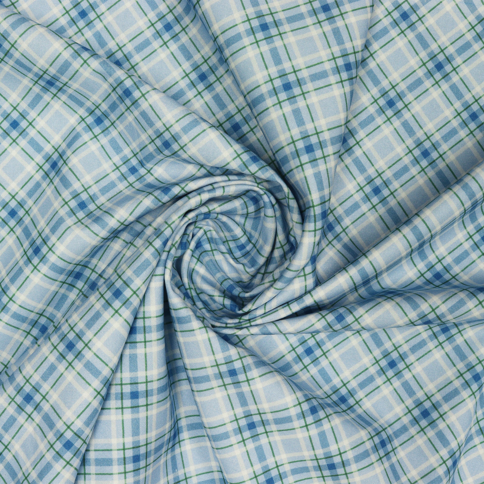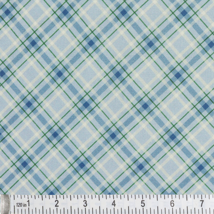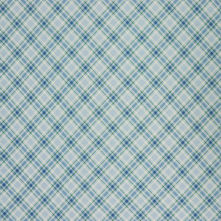 Add a frosty pop of color to your sewing stash with Plaid Wonderland Blue. This cool-toned plaid features intersecting lines of soft sky blue, deep navy, and forest green, arranged on a diagonal grid for a fresh, wintry twist. The clean geometry and versatile color palette make it ideal for pairing with nature prints, holiday scenes, or snowflake motifs. Whether used as binding, backing, or a feature print, this fabric brings a timeless yet playful touch to quilts, apparel, and home décor projects alike.