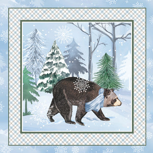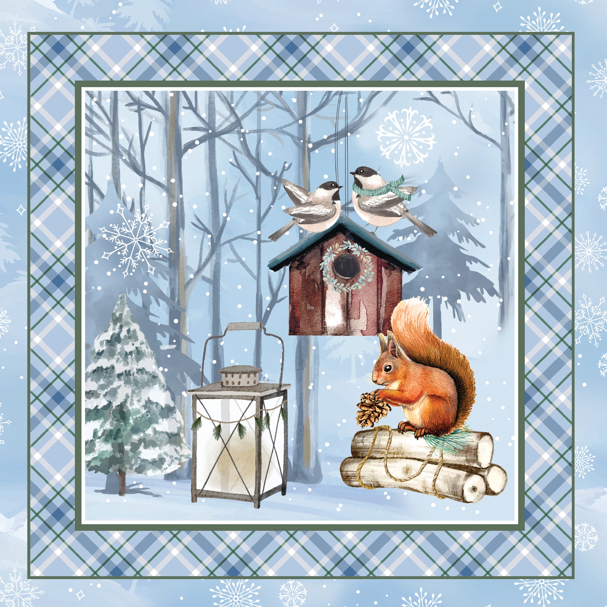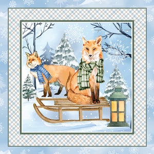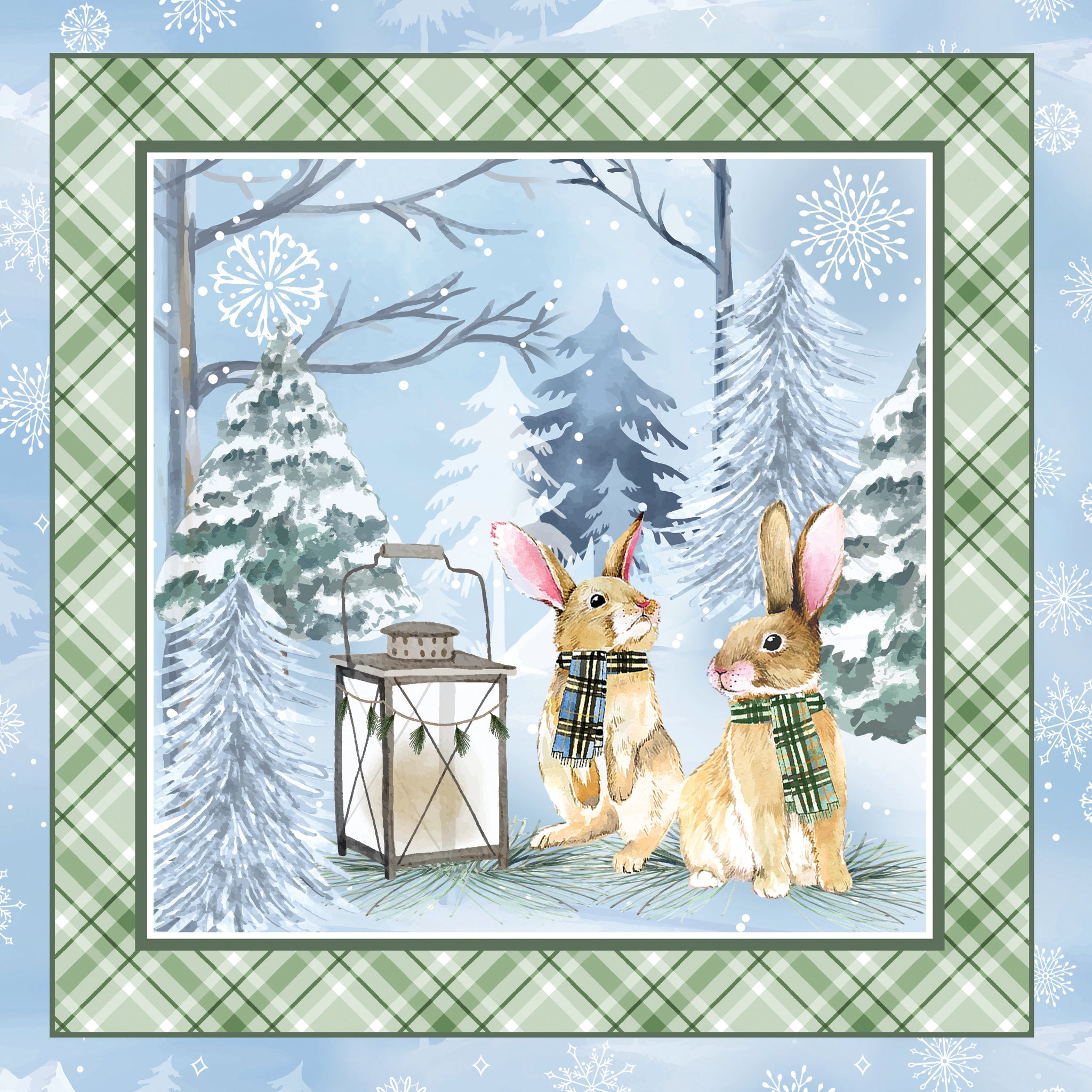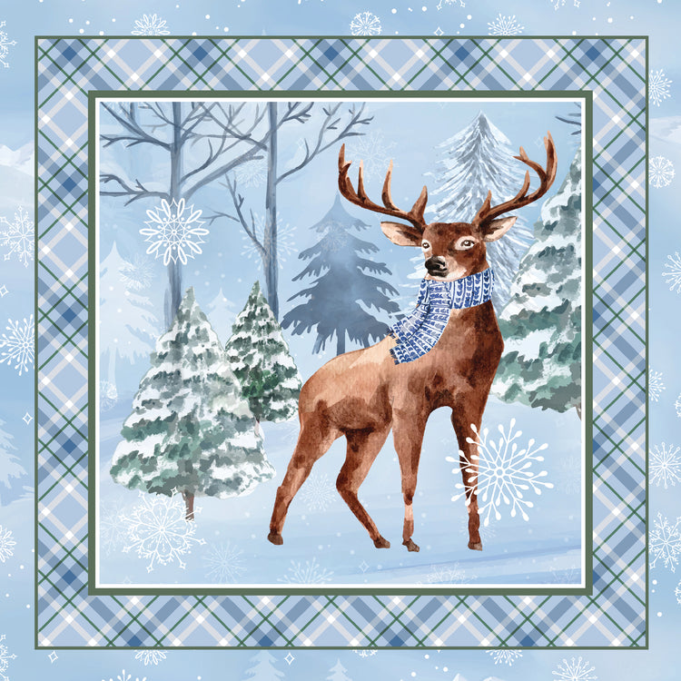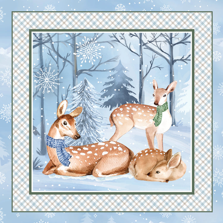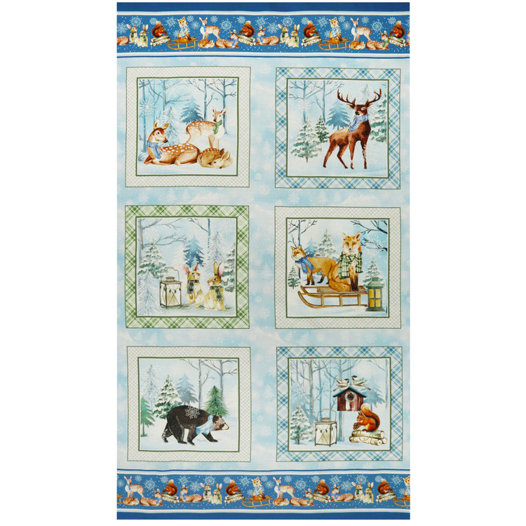 The Woodland Panel fabric offers a heartwarming winter scene that's perfect for seasonal quilts, wall hangings, or centerpieces. Measuring approximately 24" wide by 44" tall, this beautifully illustrated panel features six framed vignettes, each capturing a sweet forest moment—from cozy deer nestled in the snow to scarf-wrapped foxes, playful squirrels, bunnies, birds, and even a curious bear. Each block in the panel measures approximately 10" square, making it easy to fussy cut and incorporate into a variety of projects. Snowflakes fall gently over pine-filled backgrounds, creating a magical woodland setting in soft blues, greens, and neutrals. With its charming character details and coordinating plaid borders, this panel adds instant storytelling and whimsy to any winter project.