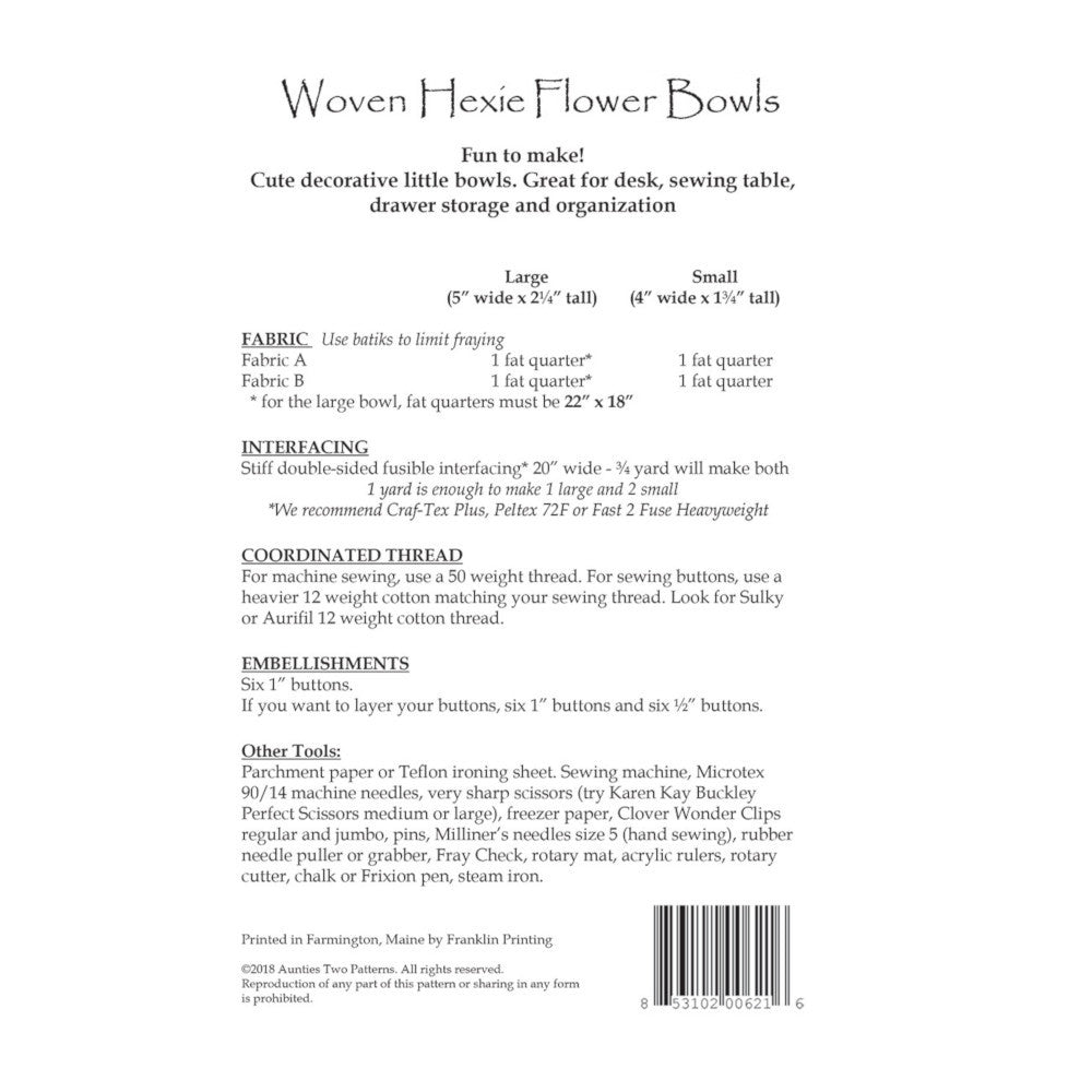 Place these cute Woven Hexi Flower Bowls around your house for aesthetics and organization. Keep them in your sewing room, office, kitchen, or even in the entryway of your home to hold keys and things. Designed by Carol McLeod of Aunties Two, the Woven Hexi Flower Bowls are meant to be used in conjunction with Bosal's Craf-Tex Double-Sided Fusible Stabilizer. Twp size options are included with the pattern, and the bigger bowl finishes to 5" wide by 2-1/4" tall while the small measures 4" wide by 1-3/4" tall.
