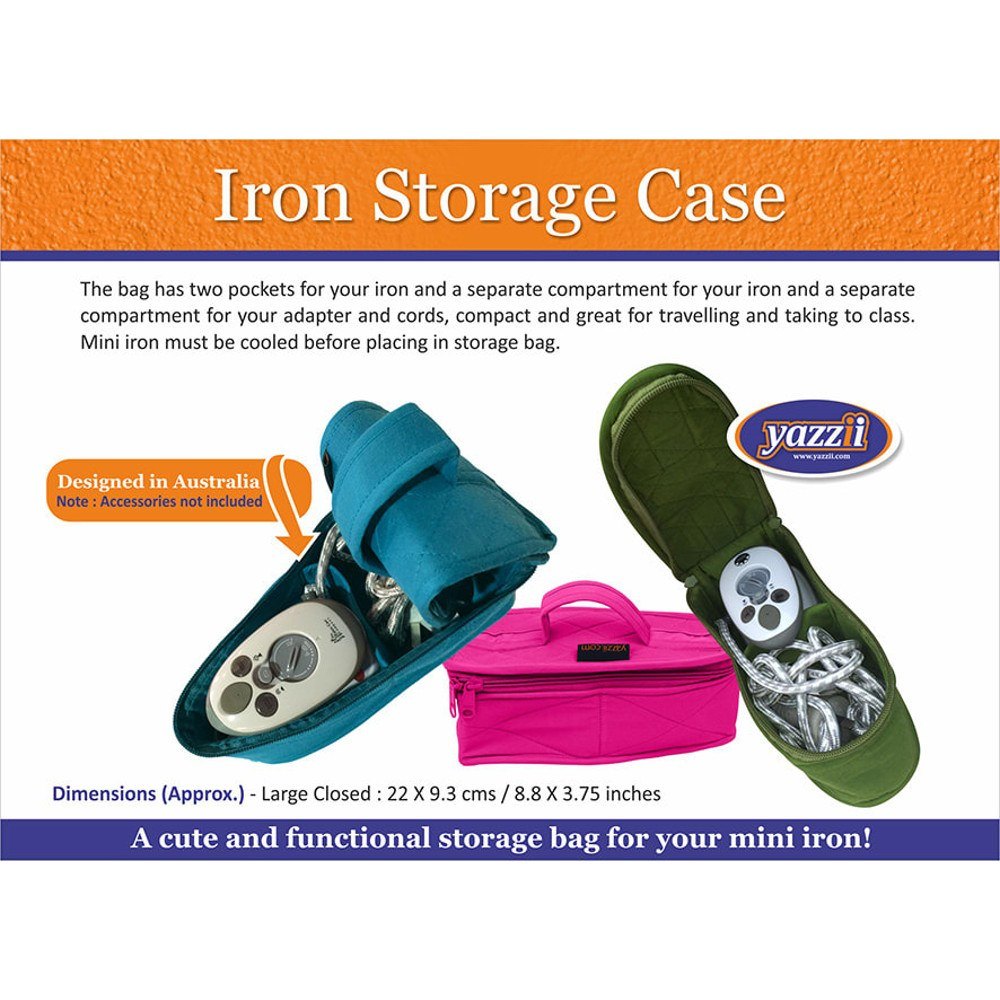 Take your mini iron with you in a Yazzii Iron Storage Case. The Yazzii Iron Storage Case is great for when you are traveling or going to sewing classes. Inside the Iron Storage Case there are two compartments; one for storing your iron and another for the adapter and cords. Before placing your iron in the Yazzii Iron Storage Case make sure it is completely cooled. Case measures 8.8" x 3.75".