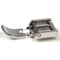 This foot can be set to sew on each side of the zipper. The edge of the foot guides the zipper to ensure straight placement.