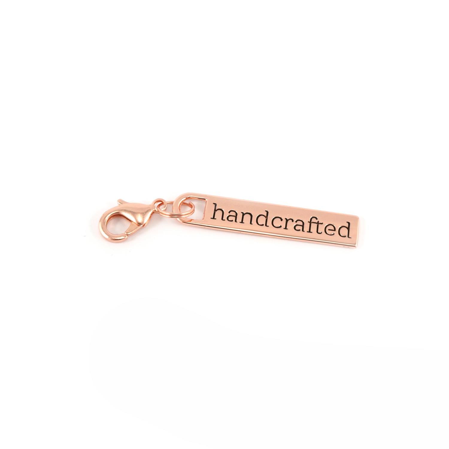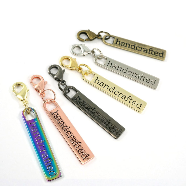 Debossed on both sides with the word "handcrafted," these Zipper Pulls will give your project a professional, finished look. Made with a sturdy lobster hook and a split ring, the hardware on these Zipper Pulls will not pull apart or break. Use the "handcrafted" Zipper Pull on openings, exterior, or interior bag pockets. One Zipper Pull is included in each pack and measures 5/16" by 1-5/8" by 1/16".